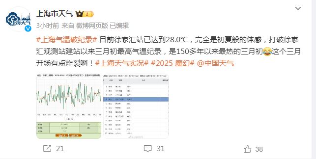 【28.0℃!上海迎来150多年以来最热三月初】上海市气象局官方微博称,3月1日14时许,上海市徐家汇站气温达到28.0℃,打破徐家汇观测站建站以来三月初最高气温纪录,是150多年以来最热的三月初。根据上海市气象服务中心此前消息,徐家汇站有正式气象记录以来,2月26日-3月5日期间,最暖的一天出现在1921年2月27日,最高气温达28.5℃,其次是1966年3月2日的27.4℃。