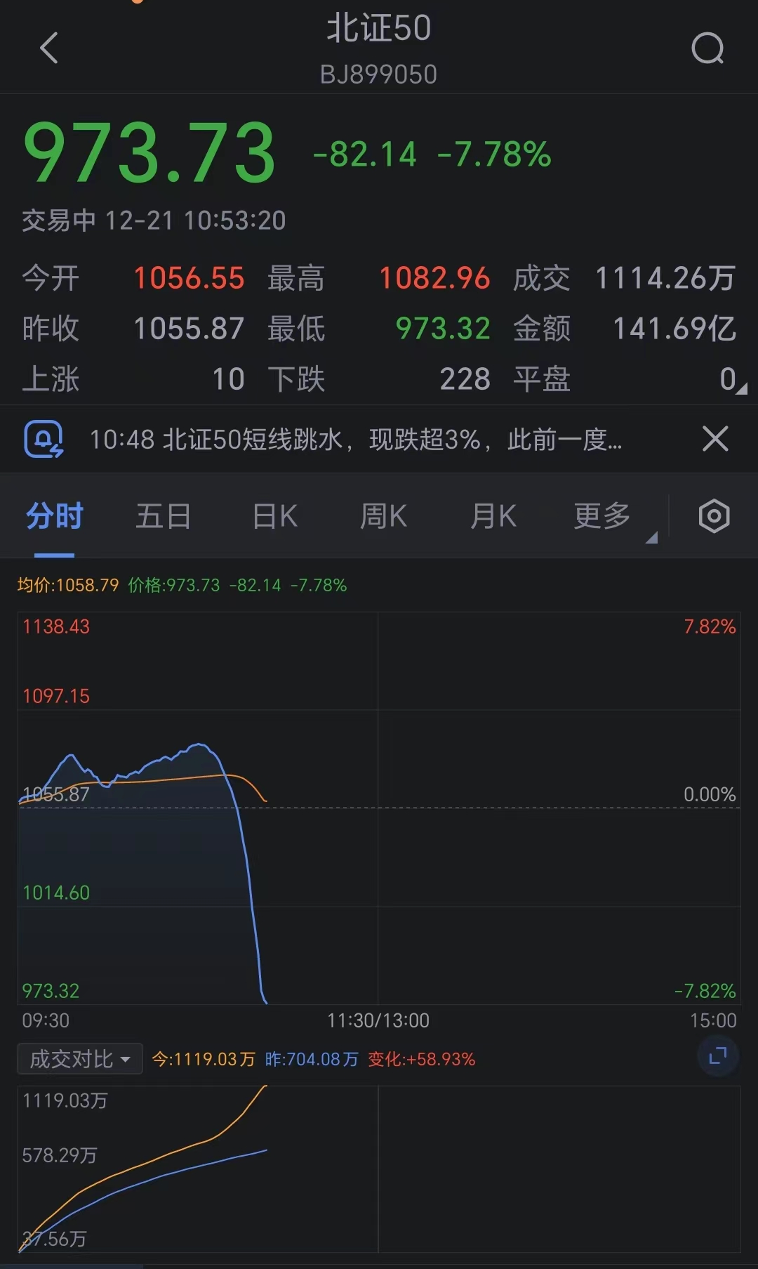 北证50指数快速跳水跌7.8%,此前一度涨超2%。北交所个股中,晶赛科技、三维股份、联迪信息、天纺标、中纺标、华阳变速等跳水跌超20%,超百股跌超10%。