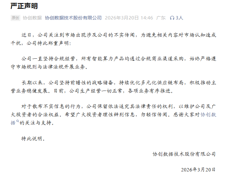 【协创数据发声明回应不实传闻:公司所有智能算力产品均通过合规商业渠道采购 目前各项业务有序推进】3月20日,协创数据发布严正声明称,近日,公司关注到市场出现涉及公司的不实传闻,为避免相关内容对市场认知造成干扰,公司郑重声明:公司一直坚持合规经营,所有智能算力产品均通过合规商业渠道采购,始终严格遵守市场规则与法律法规开展业务。长期以来,公司坚持前瞻性的战略储备,持续优化多元化供应链布局,积极推动主营业务稳健发展。目前,公司生产经营一切正常,各项业务有序推进。对于散布不实信息的行为,公司保留依法追究其法律责任的权利,以维护公司及广大投资者的合法权益。希望广大投资者理性辨别信息,勿轻信传闻。