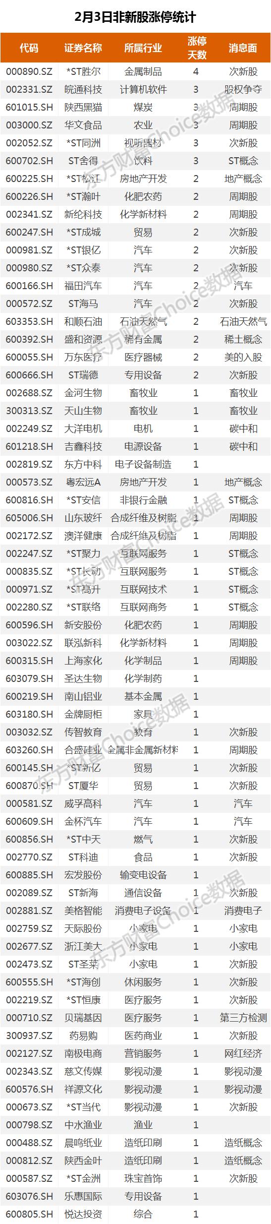 2月3日指数午后震荡走弱,市场分化明显,个股普跌,涨幅超9%个股仅50家,市场赚钱效应较差。盘面上,养殖业、动物疫苗、有机硅等板块涨幅居前,中芯国际、HIT电池、第三代半导体等板块跌幅居前。