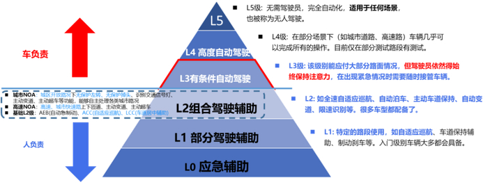 一句话说,就是从人负责到车负责的关键一跃!是的,L0-L5不是线性的,其中最关键的就是L3,前面的L0-L2核心词是“辅助”,但L3一旦达成则变为“自动”。