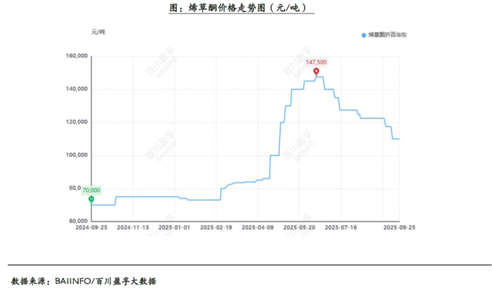 从数据来看,烯草酮价格结束2023年以来持续走低,报价2024年初的6.8万元/吨,飙升至6月的14万元/吨,到2025年7月继续涨至16万元/吨,涨幅超过135%。
