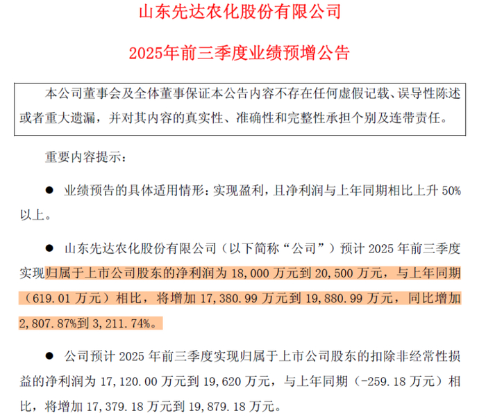 10月14日晚,先达股份(603086.SH)披露2025年前三季度业绩预告,预计实现归母净利润1.8亿-2.05亿,同比增长2,807.87%至3,211.74%,是目前已经披露的三季度业绩预告中增速最高的一家上市公司。