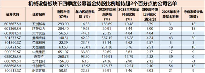 在申万31个行业中,与机器人概念关联最紧密的主要是机械设备、汽车和家用电器。接下来,我们来看这些行业在四季度被公募基金增持比例居前的公司,是否与机器人业务相关。
