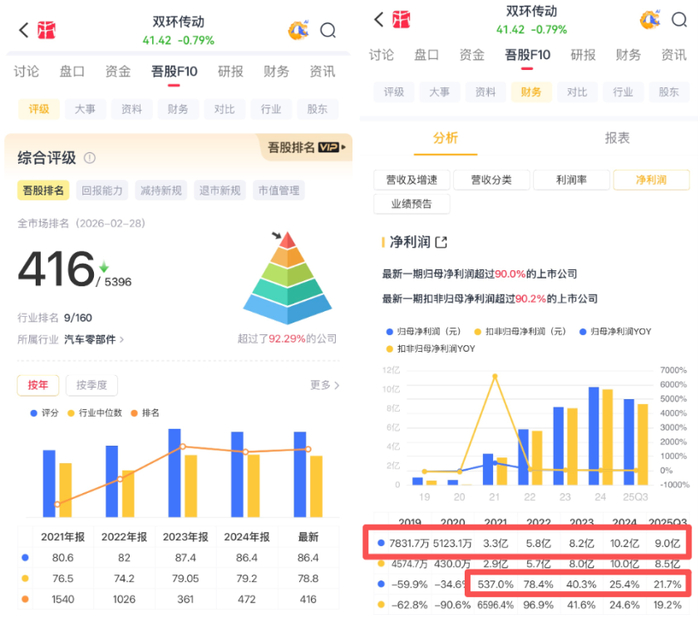 其中,公募对双环传动的持股比例也较高,四季度末达10.5%。双环传动在齿轮龙头+RV减速器双轮驱动的格局下,业绩表现同样稳健,2019年至今净利润历年收正,2025年前三季度为9亿,同比增长21.7%。