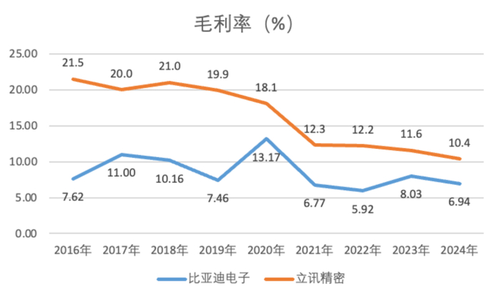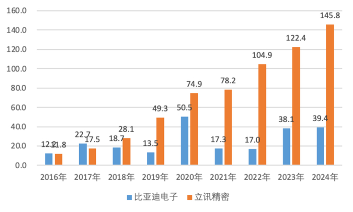 2016年比亚迪电子扣非净利润为12.2亿,立讯精密为11.8亿,到了2024年,比亚迪电子扣非净利润为39.4亿,远不如立讯精密的145.8亿,相差3倍。