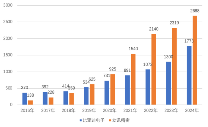 十年前的2016年,比亚迪电子营业收入为370亿,远比立讯精密138亿高,到了2024年,比亚迪电子营业收入为1773亿,不如立讯精密的营业收入为2688亿。