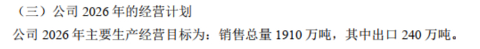 2026年经营目标:总销量1910万吨,出口240万吨。