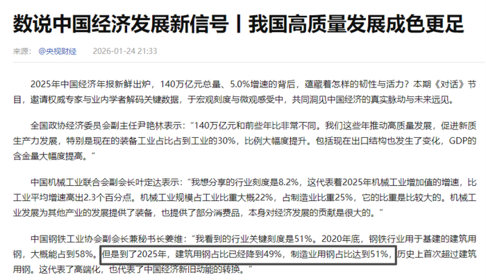 从需求结构看,国内钢铁需求的重心正从传统的建筑领域,向汽车、机械、船舶、新能源等高端制造业领域转移,2025年,制造业用钢占比达到51%,首次超越建筑用钢的49%。