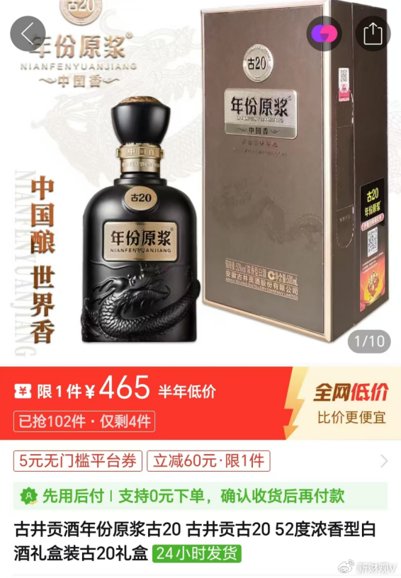 但即便暂停发货,古20的价格倒挂幅度并未得到有效改善。在刚刚过去的双十一,52度古20在拼多多百亿补贴下其价格一度跌至470元,而其他即时零售平台上的补贴价更是低至435元。这远远击穿了经销商盈利的价格锚点。