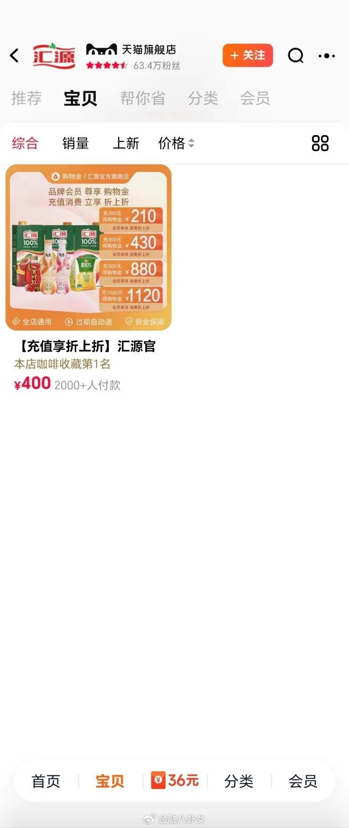 汇源抖音旗舰店有将近300万粉丝,但进去只能看到“商品上架中”;天猫旗舰店也只剩一个充值入口,63万粉丝在线围观。不过别慌,线下和其他渠道的产品照常销售,想喝还是能买到。