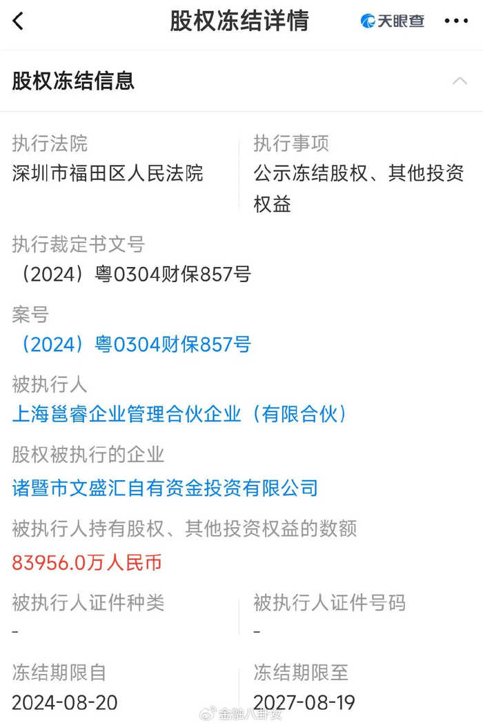 先是以侵权责任纠纷为由,将文盛资产及其关联方12个主体告上法庭,并申请诉前财产保全,冻结了上海邕睿持有的文盛汇52.47%股权。文盛随即提出复议,试图解除冻结。可没过多久,粤民投在2024年9月13日正式起诉,声称文盛方面欠款超过3亿元,并表示后续还将继续追诉。