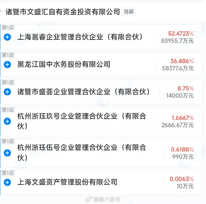 在这场资本盛宴里,国中水务(即黑龙江国中水务股份有限公司,市政供水,污水处理公司)也不甘落后,挤上了汇源重整的快车道。它不惜重金买入股权,通过文盛汇(即上海文盛设立的全资子公司诸暨市文盛汇企业管理有限公司)间接成为北京汇源股东。