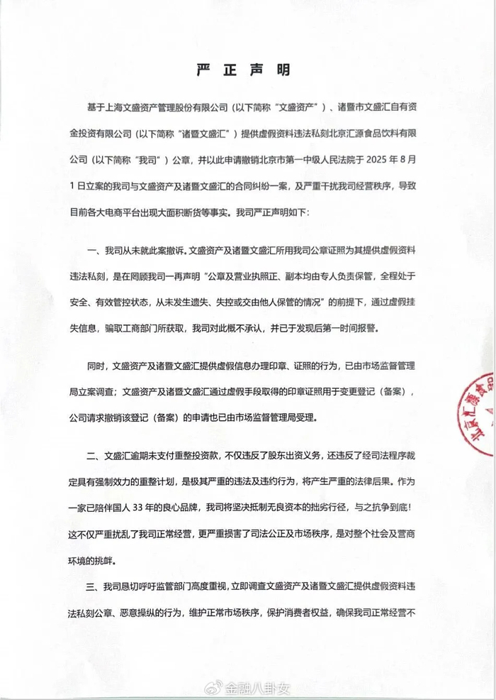 北京汇源在2025年9月12日的官方声明中直接指控:文盛资产和文盛汇凭借虚假资料违法私刻北京汇源公章,并利用该假公章申请撤销此前的合同纠纷案件,甚至干扰公司正常经营。北京汇源强调,公司公章和营业执照一直由专人保管,从未出现遗失或失控的情况;文盛方面是通过虚假挂失信息,骗取工商部门颁发相关证照。公司已第一时间报警,市场监督管理局也对文盛的违法行为立案调查;北京汇源提出撤销文盛非法办理的变更登记申请,亦已获监管部门受理。