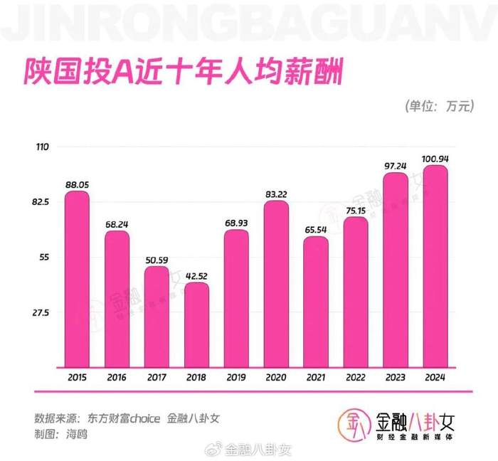 说到这里,我们来说说第二名的陕国投,属于信托行业,跟渤海租赁比起来,人均薪酬是没那么高,去年首次超过100万。