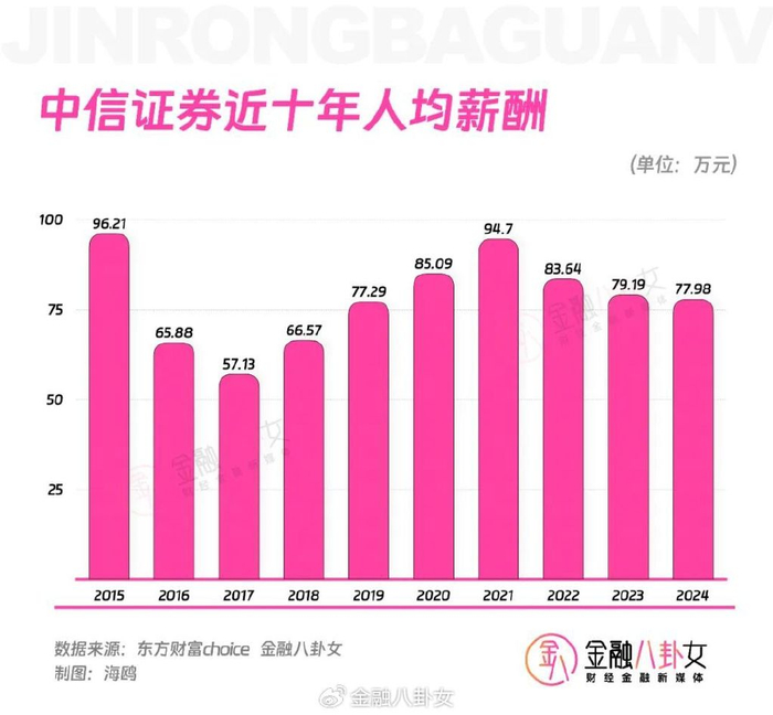 金融圈人均薪酬第三名,总算来到了券商一哥中信证券,虽然没有过百万,但是这个薪酬水平也很稳。几年前中金的人均薪酬一度超过百万,后来主动下调一波,就排到后面了(去年中金的人均薪酬64万,在券商中排第五名)。