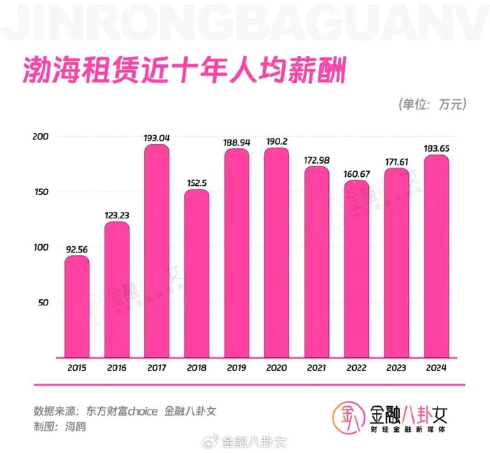 渤海租赁从2016年到现在,人均薪酬都是过百万的,而且在大部分年份更靠近200万,最近五年内,在大A人均薪酬榜上不是第一就是第二名。