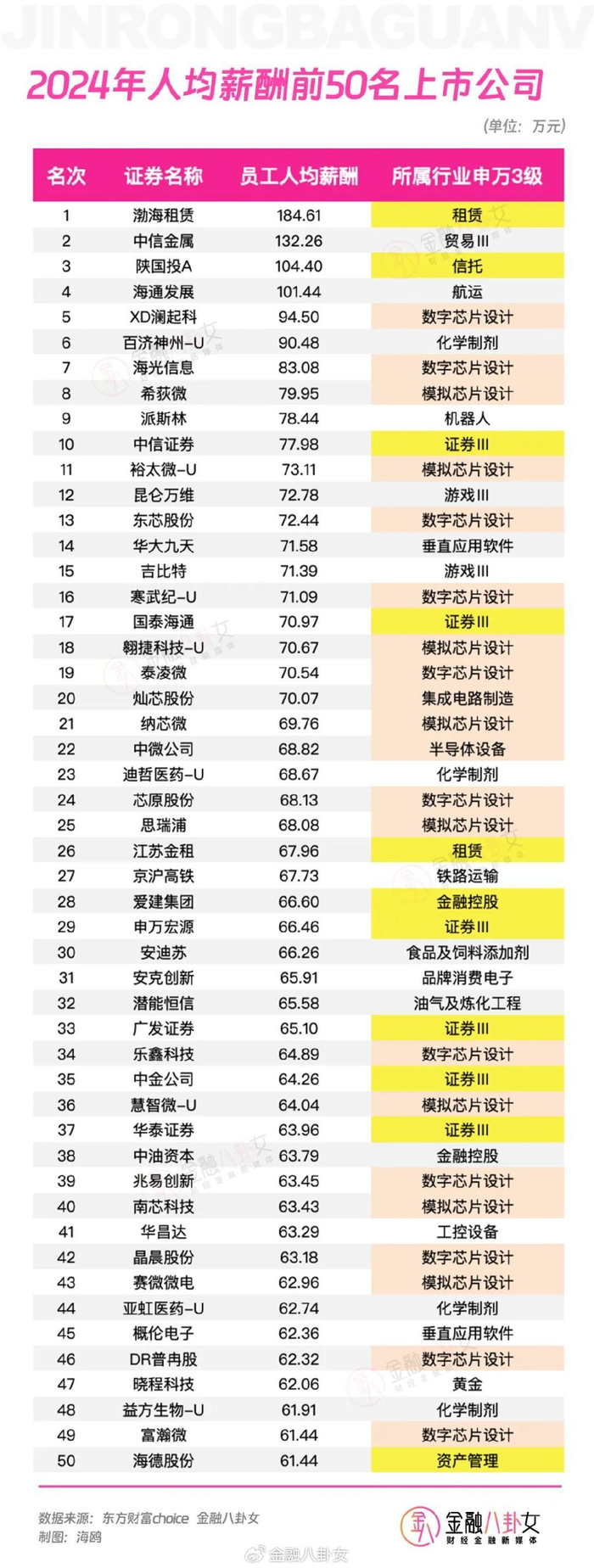 根据2024年的年报,人均薪酬前50名的上市公司当中,只剩11家是金融行业了,倒是集成电路半导体和芯片设计行业一飞冲天,占了21家公司。