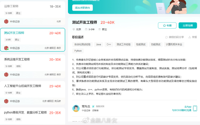 问题回来了,为啥投行、研究所、自营这些部门的岗位没往招聘网站上面挂呢?因为这些岗位主要靠内推和同行主动跳槽,行业就这么大,资源、能力、履历,很透明的,根本就不需要公开招聘。