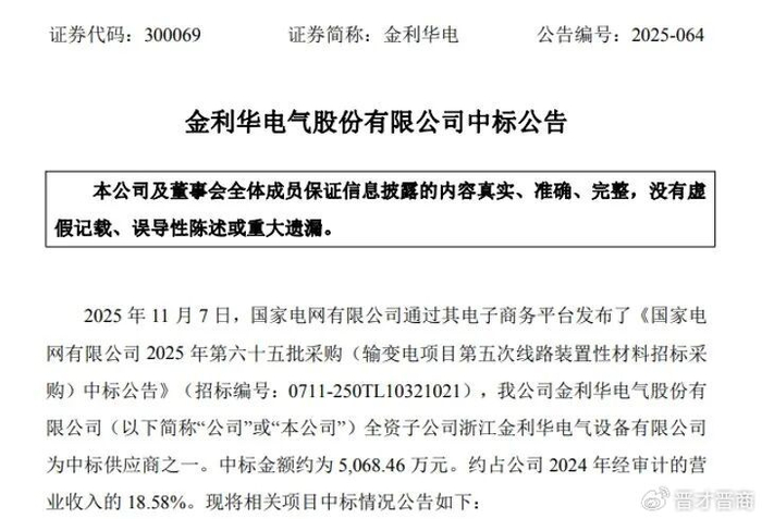 根据金利华电11月7日发布的公告,本次中标项目为国家电网有限公司2025年第六十五批采购(输变电项目第五次线路装置性材料招标采购)。
