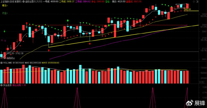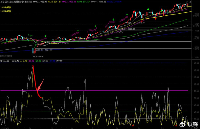 收盘在新浪微博做解盘,想到过一个指标:天人合一!告诉大家,2025年4月14日,天人合一指标均线下破50数值,从这一天起,指数开始走牛至今,期间没有一次人线上破50数值出现。有朋友问我,大盘见不见顶,是不是也可以盯住人线上不上破50数值?原则上是可以的,在实际的操作中,也要注意可能出现的骗线问题。退一万步讲,你可以这样理解:大盘日线级别天人合一人线下破50数值,是市场个股可以操作的一个开始;当有一天日线级别天人合一人线上破50数值,则意为市场个股的机会减少或停止。我这样讲,不知道你能不能理解,再讲的明白一点儿,你可以把天人合一理解为进出场的标准,符合的时候就进场,反之就要离场观望!