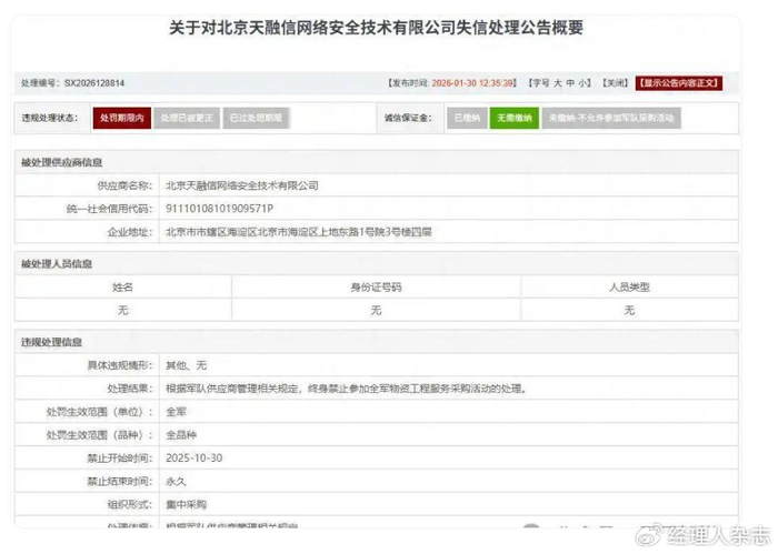 2026年1月30日,军队采购网一则失信处理公告引发网络安全行业震动——北京天融信网络安全技术有限公司(天融信孙公司)被正式处以终身禁止参加全军物资工程服务采购活动的顶格处罚。