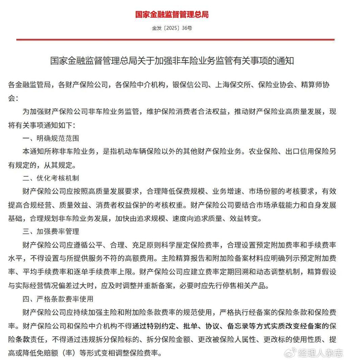 然而,就在公司完成外资独资化转型不久,监管政策的加码进一步抬高了其经营难度。11月1日,金融监管总局《关于加强非车险业务监管有关事项的通知》(下称《通知》)正式实施,明确提出非车险业务“报行合一”等刚性要求,即产品费率与备案标准须保持一致,不得变相打折或变通执行,这较大程度上压缩了险企在定价策略上的弹性空间。