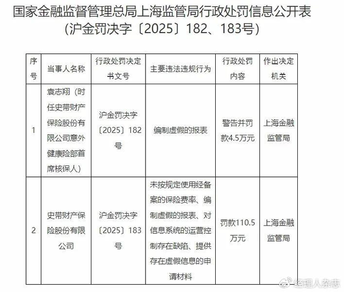 同时,因“编制虚假的报表”,对公司时任意外健康险部首席核保人袁志翔进行警告并罚款4.5万元。