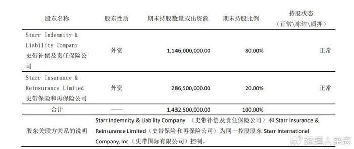 8月7日,上海监管局披露称,同意史带补偿及责任保险公司(Starr Indemnity &Liability Company)受让上海锦江国际投资有限公司持有的公司1120万股股份(0.78%股权)。受让后,史带补偿及责任保险公司(Starr Indemnity&Liability Company)合计持有公司114600万股股份,持股比例为80%。