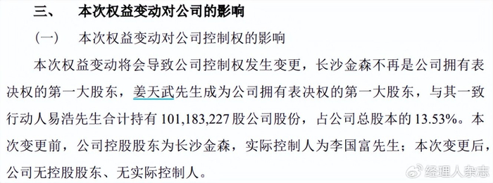 时间来到今年8月,随着持股5%以上股东李建伟与金森新能解除一致行动人关系,并不再进行表决权委托,加上姜天武所持13.52%股权对应的表决权恢复行使,金森新能拥有的表决权对应的持股比例下降至10.3%,这也意味着,金森新能不再是公司拥有表决权的第一大股东,姜天武成为公司拥有表决权的第一大股东,由于各方股权分散等原因,公司进入无控股股东、无实际控制人状态。