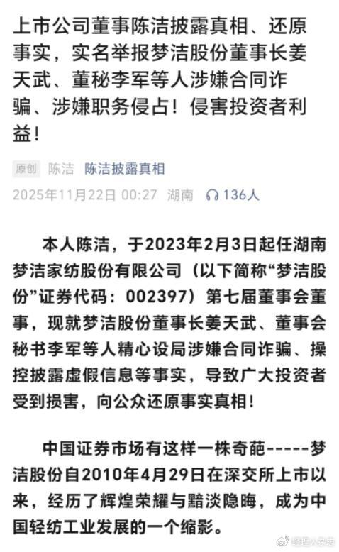 梦洁股份的“内斗”风波正通过社交媒体持续发酵。整个过程始于11月11日微信公众号“陈洁披露真相”的注册。随后,账号主体、梦洁股份董事陈洁于11月12日、13日及22日连续发布三篇实名举报文章,矛头直指董事长姜天武与董秘李军,指控其涉嫌合同诈骗、操纵披露虚假信息等事实,将公司内部矛盾彻底公之于众。