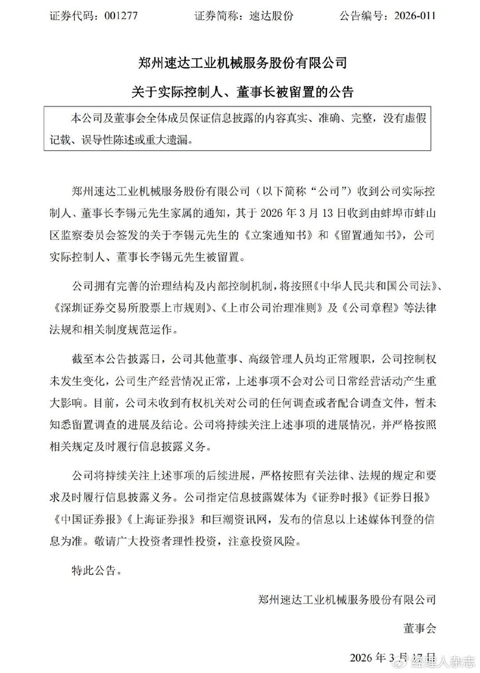 根据公告,速达股份于3月16日收到李锡元家属通知,其已收到监察机关签发的《立案通知书》和《留置通知书》,被依法采取留置措施。公司明确表示,目前其他董事、高级管理人员均正常履职,公司控制权未发生变化,生产经营情况正常,该事项不会对日常经营活动产生重大影响。截至公告披露日,公司未收到有权机关针对公司的任何调查或配合调查文件,暂未知悉留置调查的进展及结论,后续将持续关注并及时履行信息披露义务。