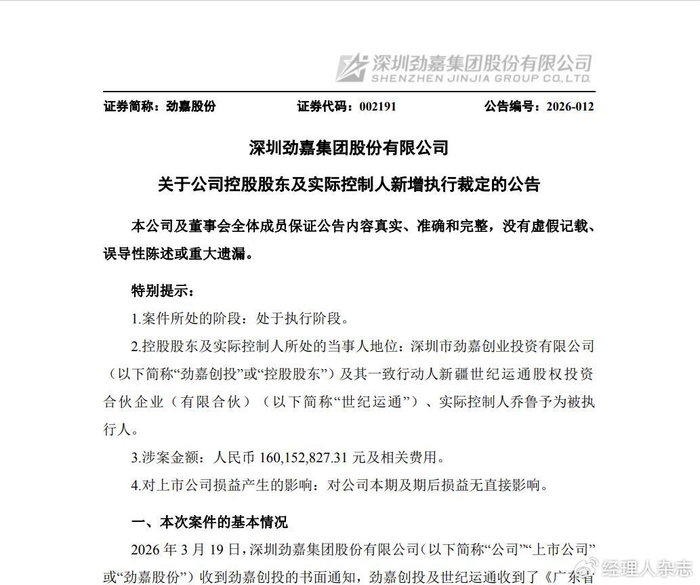 2026年3月19日,深圳劲嘉集团股份有限公司(简称“劲嘉股份”,002191)发布公告披露,公司控股股东深圳市劲嘉创业投资有限公司(下称“劲嘉创投”)及其一致行动人、实际控制人乔鲁予新增执行裁定,涉案金额达1.602亿元及相关费用,案件已正式进入执行阶段。这一消息再度将劲嘉股份控股股东的债务危机推向公众视野,也让公司控制权稳定性面临严峻考验。