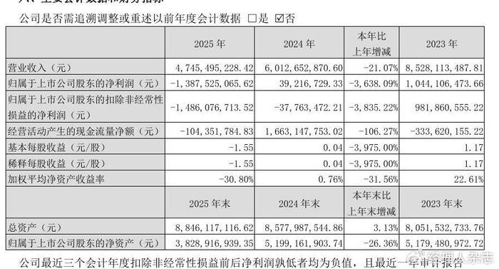 3月20日,纯碱行业龙头山东海化(000822.SZ)披露2025年年报,交出了一份令人意外的成绩单。数据显示,公司全年实现营业收入47.45亿元,同比下降21.07%;归属于上市公司股东的净利润亏损13.88亿元,较上年同期的3921.67万元由盈转亏,降幅高达3638.09%,创下上市以来最差业绩表现,也折射出2025年纯碱行业的深度调整困境。