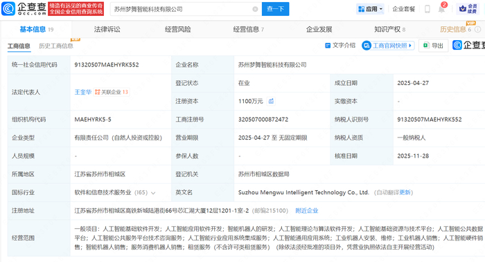 企查查APP显示,近日,苏州梦舞智能科技有限公司发生工商变更,新增徕木股份(603633)为股东,同时注册资本由1000万元增至1100万元。企查查信息显示,该公司成立于2025年4月,法定代表人王奎华,经营范围包含人工智能基础软件开发、人工智能应用软件开发、智能机器人的研发等,由江苏长河投资有限公司、牧牛生长股权投资(苏州)合伙企业(有限合伙)及上述新增股东等共同持股。