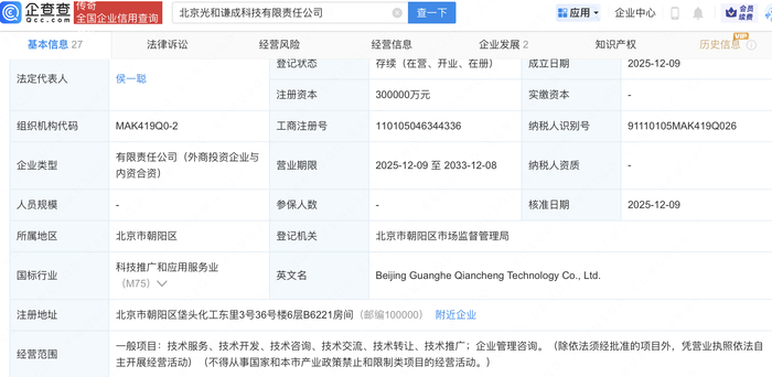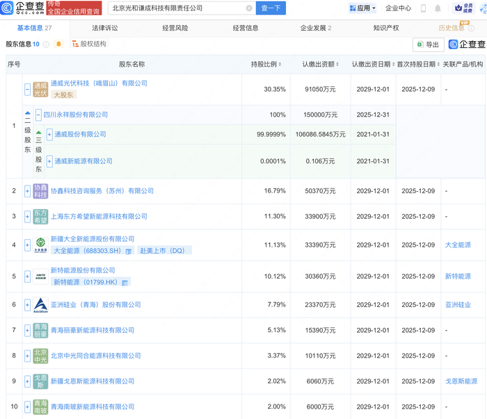 企查查APP显示,近日,北京光和谦成科技有限责任公司正式登记成立,法定代表人为侯一聪,注册资本30亿元,经营范围包含:技术服务、技术开发、技术咨询、技术交流、技术转让、技术推广;企业管理咨询。企查查股权穿透显示,该公司由通威股份(600438)旗下通威光伏科技(峨眉山)有限公司、协鑫科技咨询服务(苏州)有限公司、大全能源(688303)、新特能源(01799.HK)等共同持股,其中通威光伏科技(峨眉山)有限公司持股30.35%,大全能源和新特能源分别持股11.13%、10.12%。
