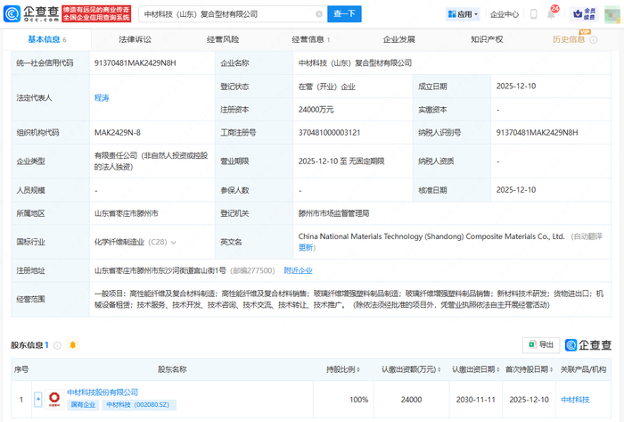 企查查APP显示,近日,中材科技(山东)复合型材有限公司成立,法定代表人为程涛,注册资本2.4亿元人民币,经营范围涉及高性能纤维及复合材料制造、高性能纤维及复合材料销售、玻璃纤维增强塑料制品制造等。企查查股权穿透显示,该公司由中材科技(002080)全资持股。