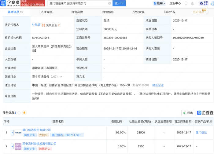 企查查APP显示,近日,厦门信达诺产业投资有限公司成立,注册资本3亿元,经营范围包含:以自有资金从事投资活动;信息咨询服务(不含许可类信息咨询服务)。企查查股权穿透显示,该公司由厦门信达(000701)等共同持股。
