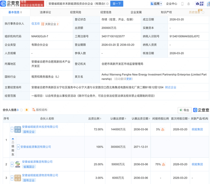 企查查APP显示,近日,安徽省皖能丰禾新能源投资合伙企业(有限合伙)成立,出资额20亿元,经营范围包含:以自有资金从事投资活动。企查查股权穿透显示,该企业由安徽省能源集团有限公司全资子公司安徽省皖能资本投资有限公司等共同出资。