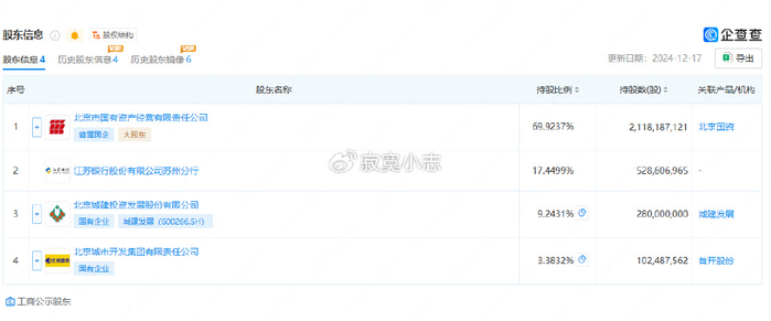初始股东方面,北京市国资经营公司为第一大股东,此外股东还包括本次挂牌的两家北京市属国企北京城建集团、首开集团。
