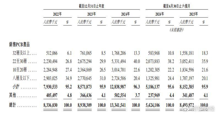 从PCB产品层数划分看,沪电股份22层至30层、32层及以上PCB产品收入占比趋高,由2022年的32.9%升至2025年上半年的54.2%;10至20层、8层及以下PCB产品收入占比则由62.3%降至41.7%。