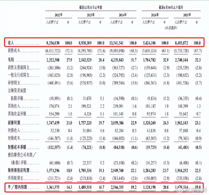 近年来沪电股份的营收和利润保持增长。招股书显示,2022年- 2025年上半年,公司实现收入分别为83.36 亿元、89.38 亿元、133.42 亿元、84.94 亿元;同期净利润分别为13.62 亿元、14.90 亿元、25.66 亿元、16.78 亿元。毛利率分别为27.9%、28.4%、31.7%、32.3%。