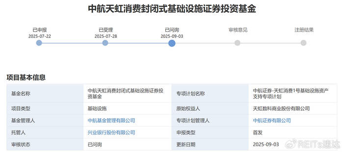 截至公告发布,交易所网站显示“中航天虹消费REIT”状态为已问询。