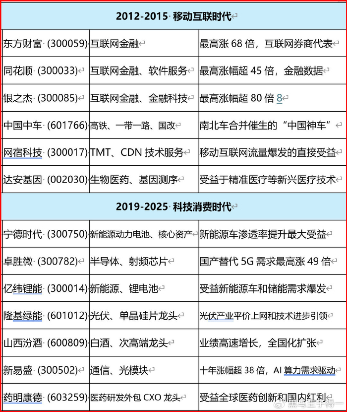 2019-2025年,经济迈向高质量发展阶段,新质生产力成为关键词。新能源(宁德时代、亿纬锂能)、半导体(卓胜微)、AI算力(新易盛)接过了牛股的接力棒。