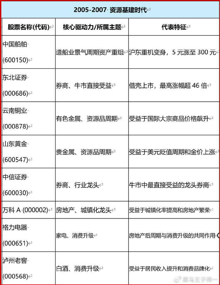 回顾A股2005年至2025年的20年历史,可以清晰地看到,市场的起伏背后是时代的变迁和产业的更迭。那些穿越周期、实现惊人涨幅的“牛股”,并非凭空产生,而是深深刻上了时代的烙印。下面,我梳理了这个时间段内最具代表性的21只牛股,并尝试探寻它们背后的共同基因。