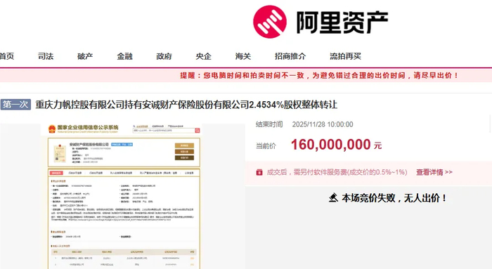 据阿里司法拍卖网显示,11月28日,重庆力帆控股所持安诚财产保险股份有限公司(下称“安诚保险”)2.45%股权再次流拍,起拍价为1.6亿元。