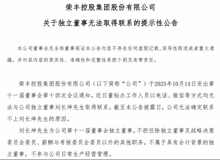#独董不明原因失联公司拟改聘#【董事会召开前夕 *ST荣控独董刘长坤失联 公司称原因不明拟改聘】10月26日,*ST荣控公告称,近日通过多种方式无法与公司独立董事刘长坤取得联系,具体原因不明。该公司一位高管称,三季报需董事签字确认,但一直联系不上刘长坤。*ST荣控表示,现阶段刘长坤失联不影响董事会运作。此外,*ST荣控正寻求转型,前三季度营收增近4倍,但仍未实现盈利,且现金流紧张,第三季度货币资金余额大幅减少。值得注意的是,*ST荣控在公告中称,公司董事会将密切关注相关事项的进展情况,并根据刘长坤的履职能力采取包括改聘独立董事等措施,以保证董事会规范运作。