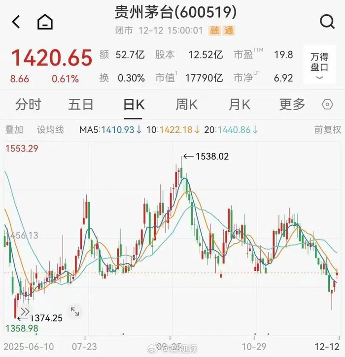 二级市场方面,截至12月12日,贵州茅台(600519.SH)股价收报1420.65元/股,总市值17790亿元。(21财经)