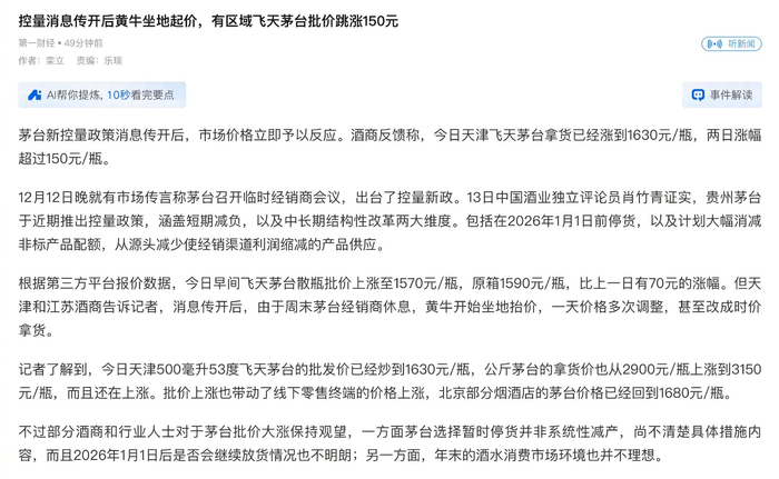 【#茅台控量政策#消息传开后黄牛坐地起价,#有区域飞天茅台批价涨超150元#】#有烟酒店茅台价格回到1680元#茅台新控量政策消息传开后,市场价格立即予以反应。酒商反馈称,今日天津飞天茅台拿货已经涨到1630元/瓶,两日涨幅超过150元/瓶。根据第三方平台报价数据,今日早间飞天茅台散瓶批价上涨至1570元/瓶,原箱1590元/瓶,比上一日有70元的涨幅。但天津和江苏酒商告诉记者,消息传开后,由于周末茅台经销商休息,黄牛开始坐地抬价,一天价格多次调整,甚至改成时价拿货。记者了解到,今日天津500毫升53度飞天茅台的批发价已经炒到1630元/瓶,公斤茅台的拿货价也从2900元/瓶上涨到3150元/瓶,而且还在上涨。批价上涨也带动了线下零售终端的价格上涨,北京部分烟酒店的茅台价格已经回到1680元/瓶。