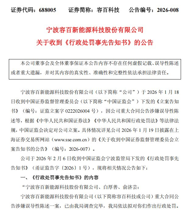 【容百科技:因发布与宁德时代签署重大合同公告涉嫌误导性陈述 拟被给予警告并处以450万元罚款】#容百科技被罚450万元#容百科技公告,收到中国证监会宁波监管局下发的《行政处罚事先告知书》。公司因2026年1月13日发布的与宁德时代签署重大合同公告涉嫌误导性陈述,拟被中国证监会宁波监管局给予警告并处以450万元罚款。董事长白厚善及董事会秘书俞济芸拟分别被罚款300万元和200万元。(财联社)